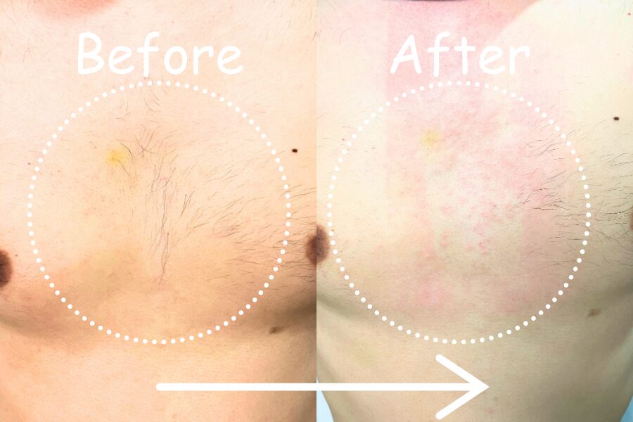 胸毛がスッキリしました! 今回は胸毛の中央部分の脱毛でした! 脱毛が終わった直後は少し赤みが出ています 赤みは2、3日で治りますのでご安心ください😊 左胸の残り毛は次回処理しますね😊 当サロンの美容電気脱毛(ニードル脱毛)では、... -